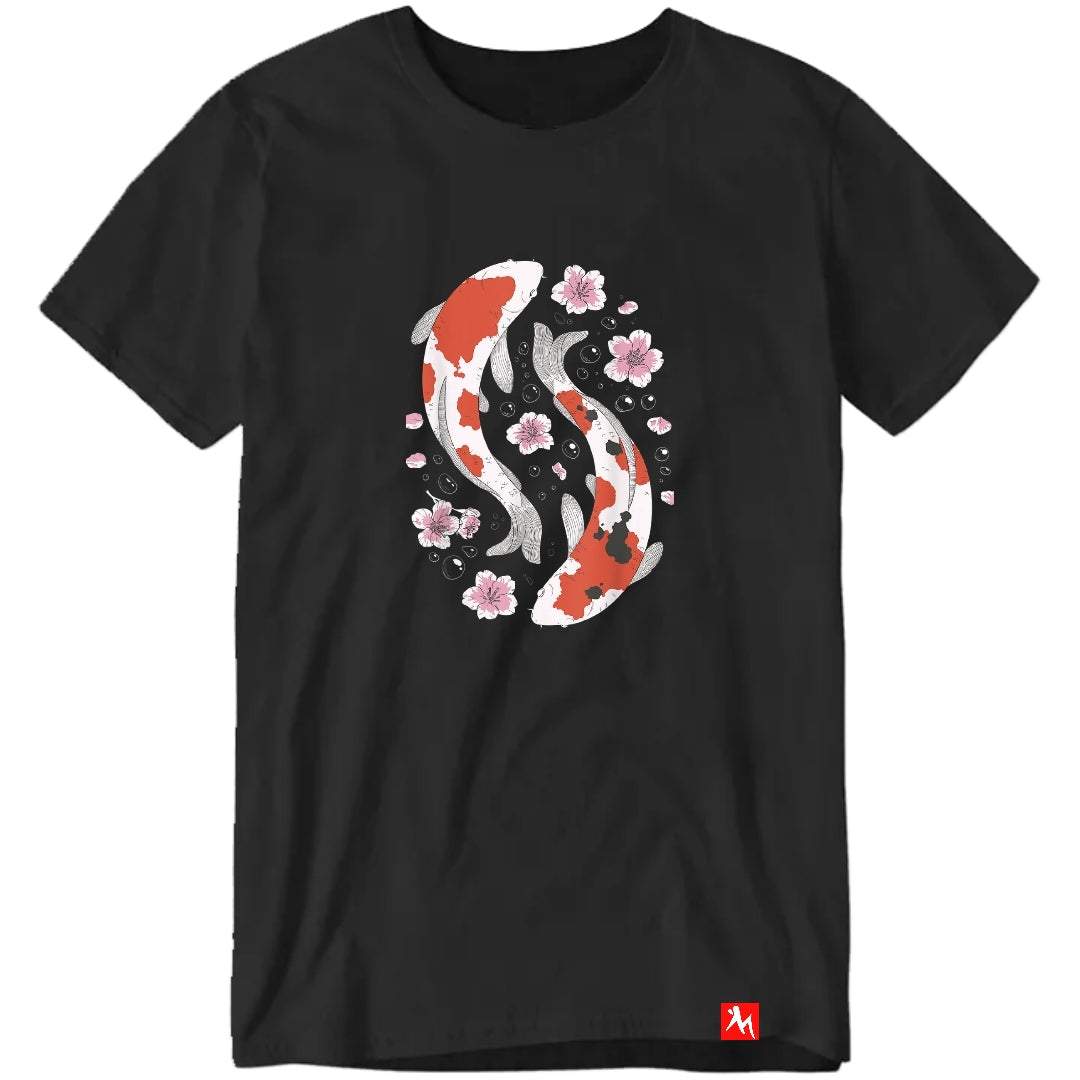 Polera con la ilustración de 2 hermosos peces Koi tambien llamados Nishikigoi. En la imagen vemos 2 peces nadando rodeados por flores de cerezo.